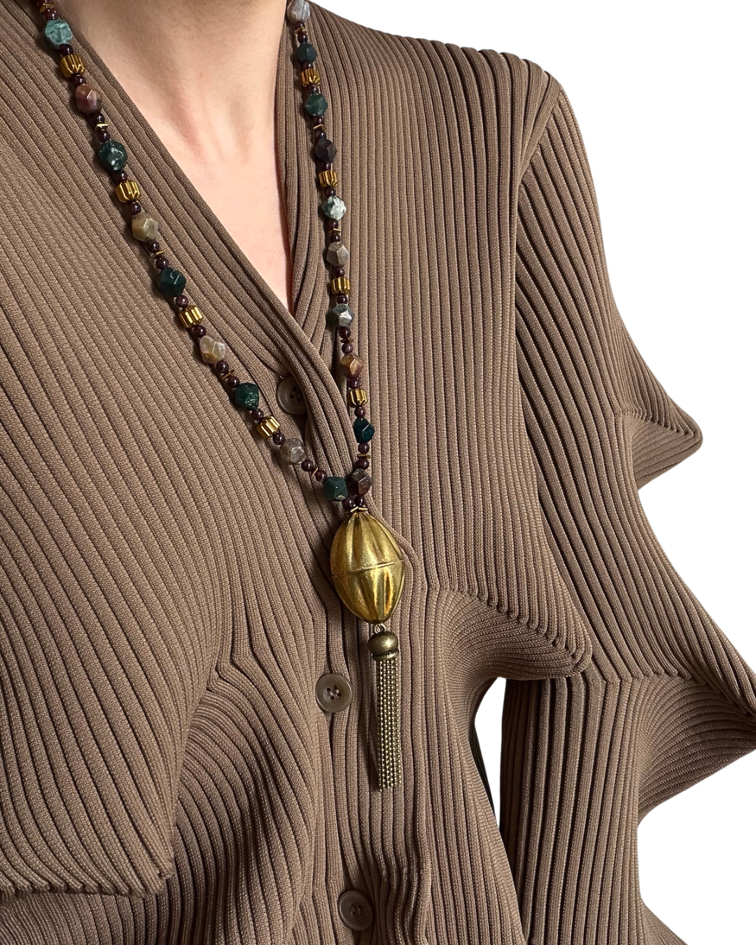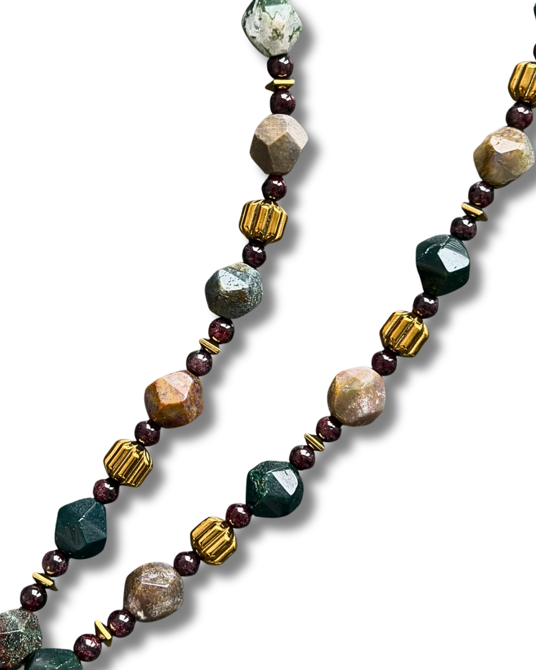 - Materials: natural garnet, Indian agate, hematite, lightly gold-plated metal charm