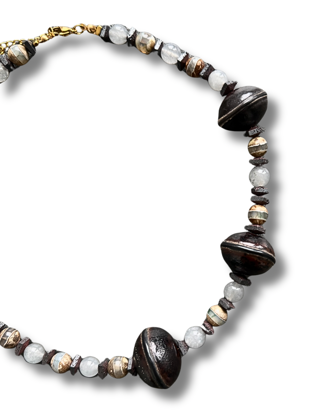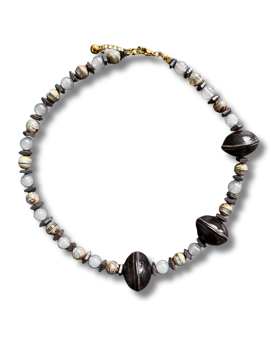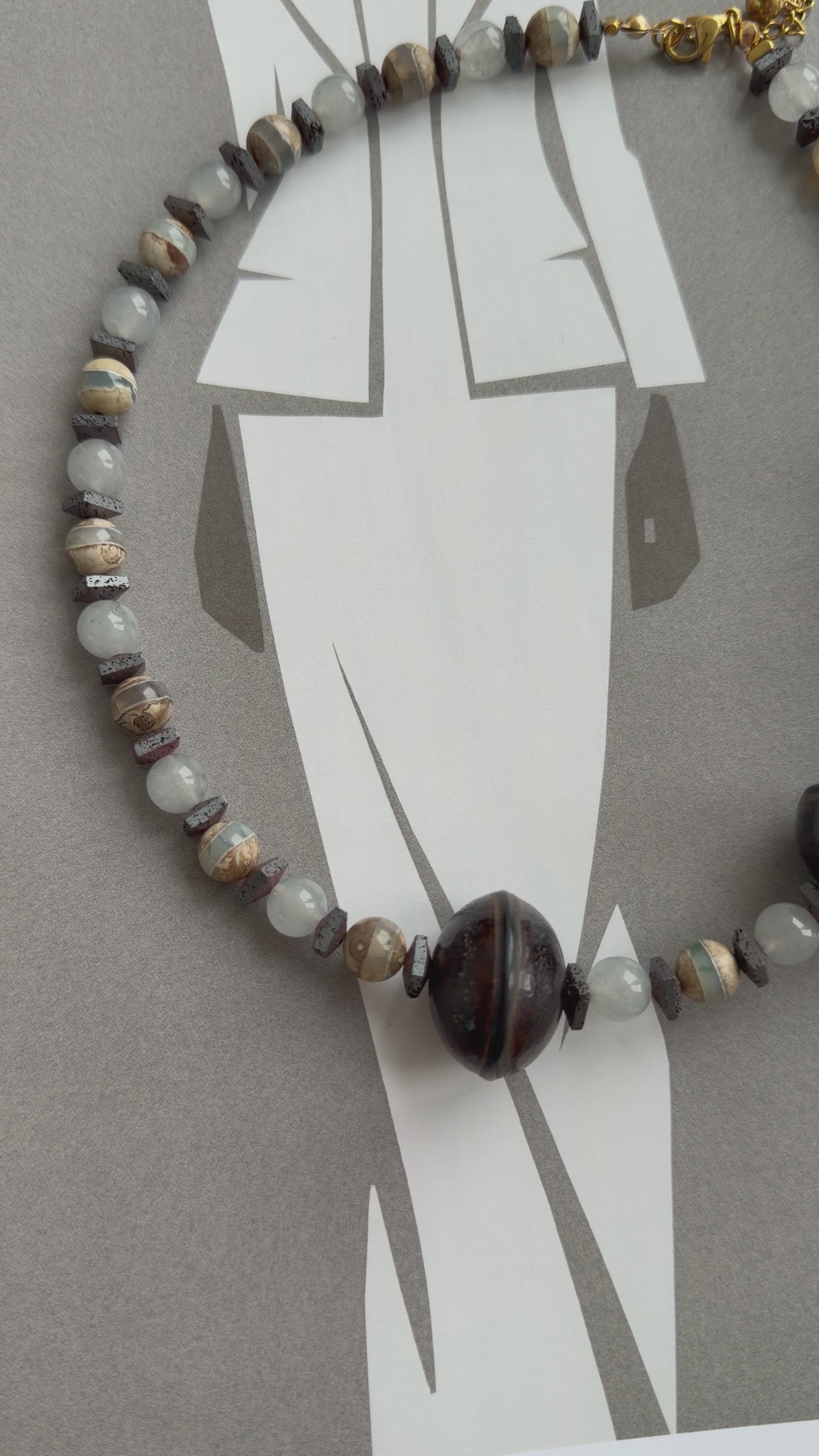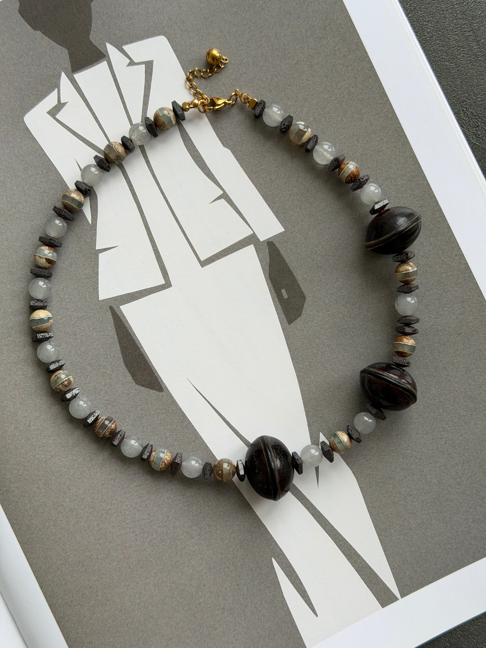 - Materials: Dzi agate beads, gray chalcedony