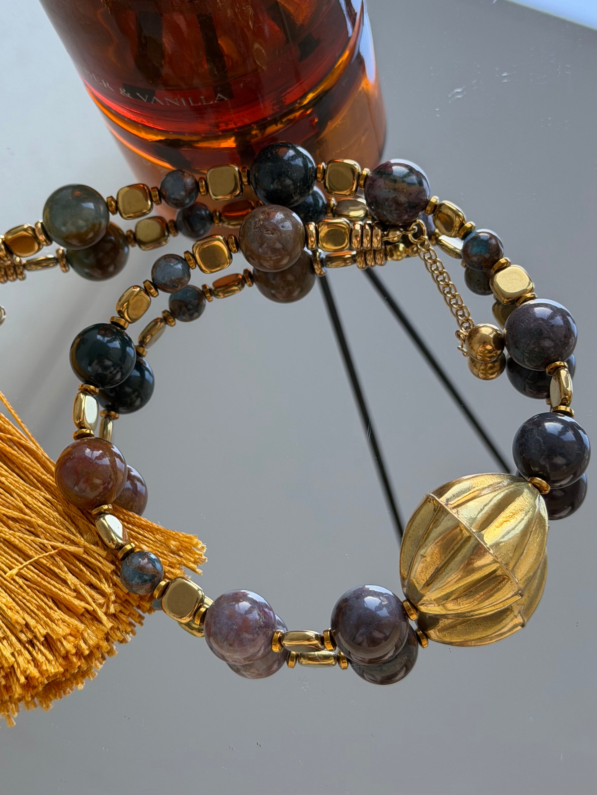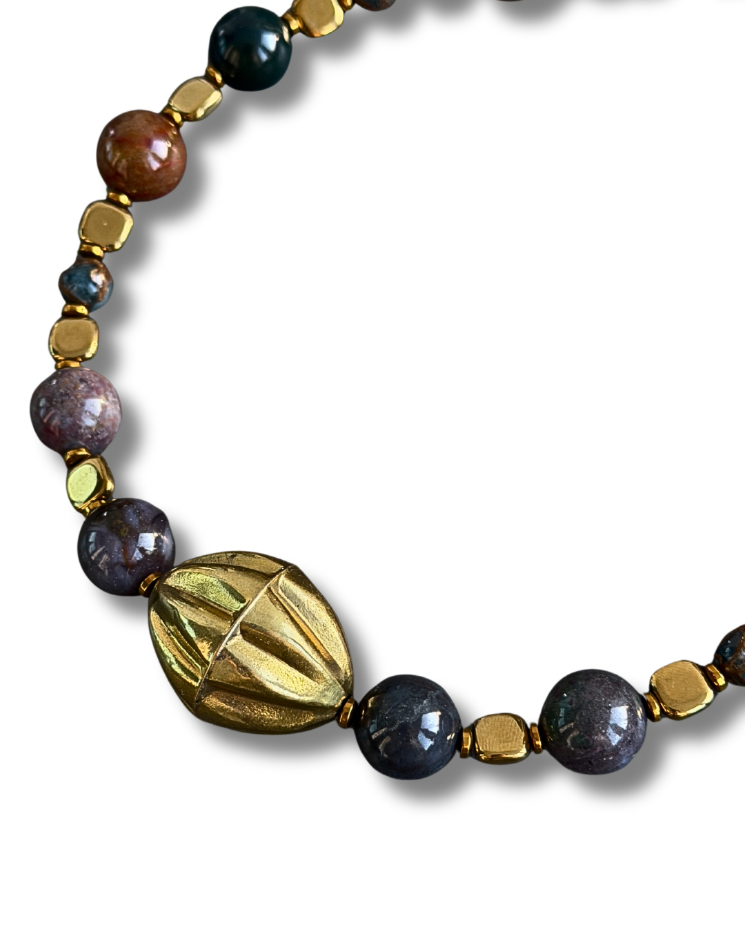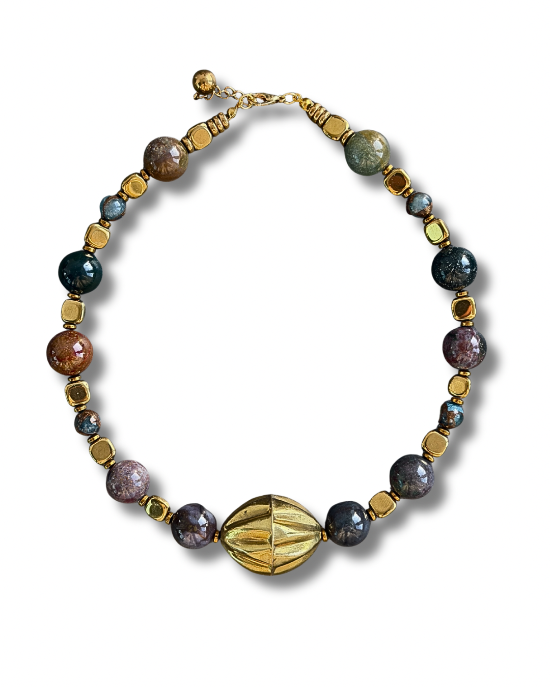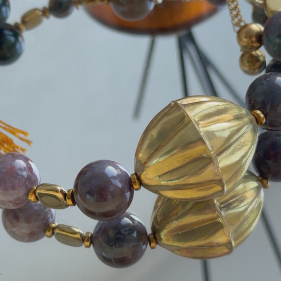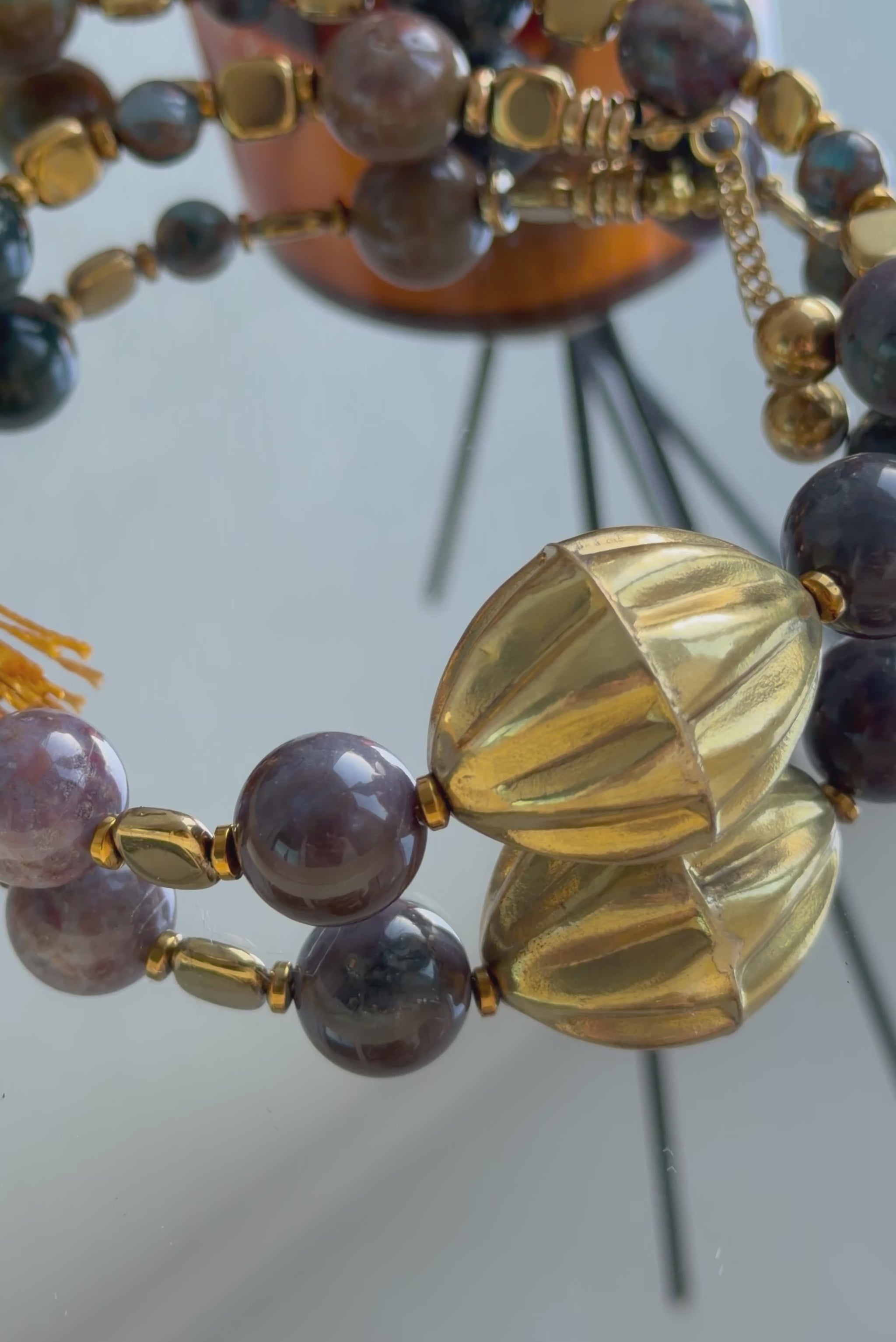 - Materials: lightly gold-plated metal charm, moss agate, hematite