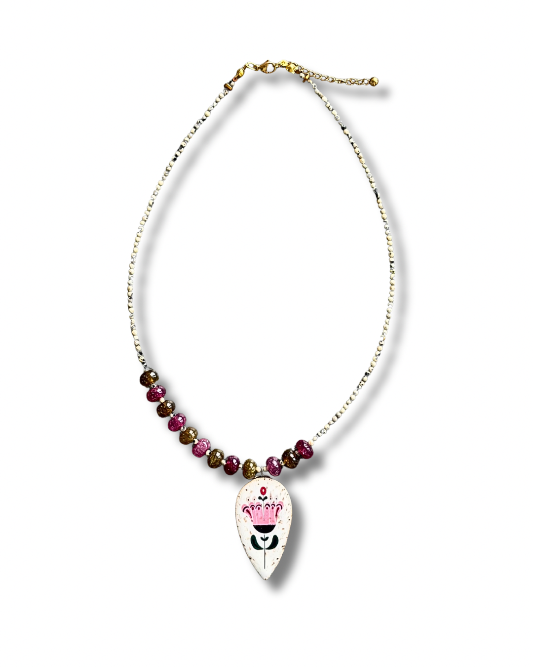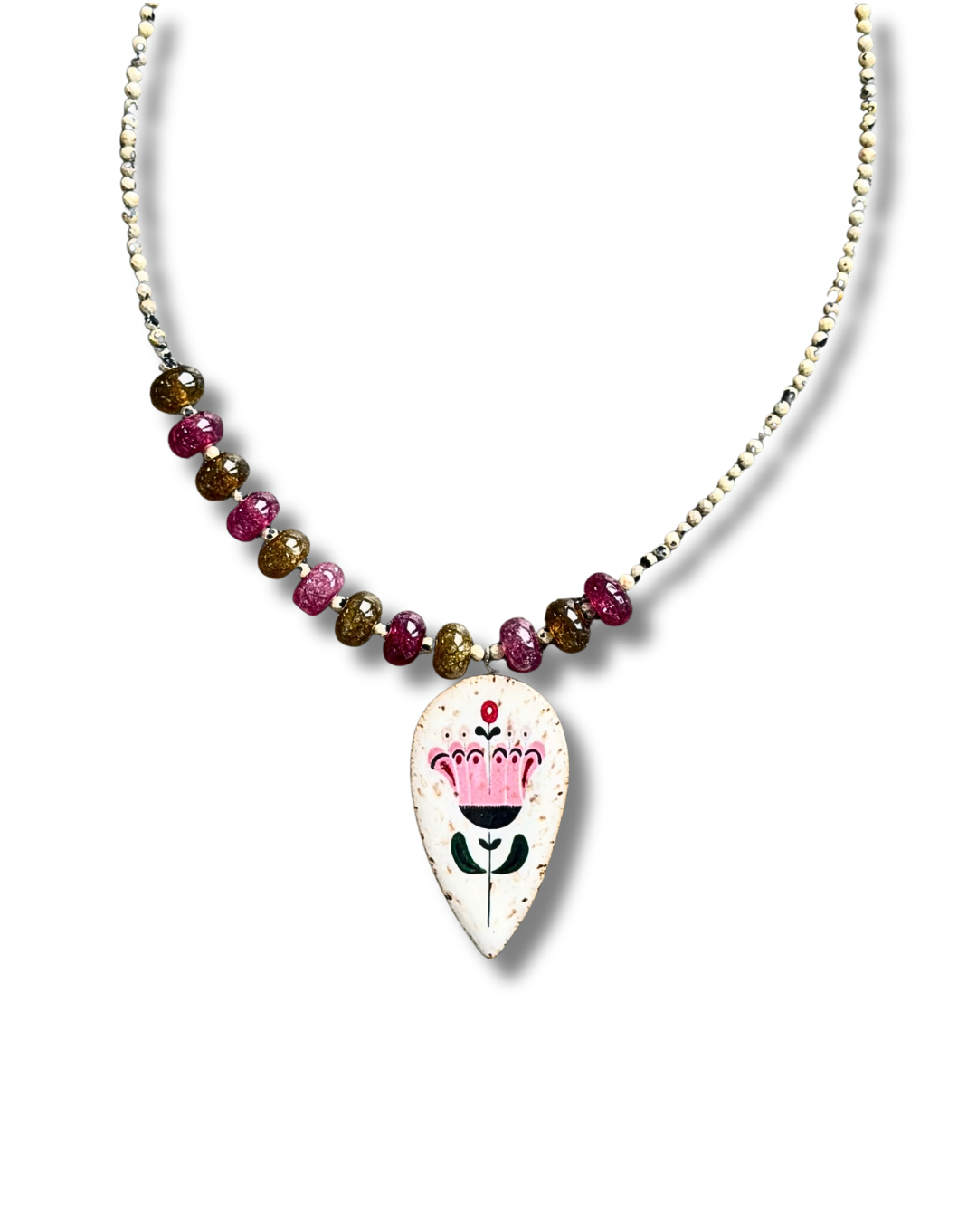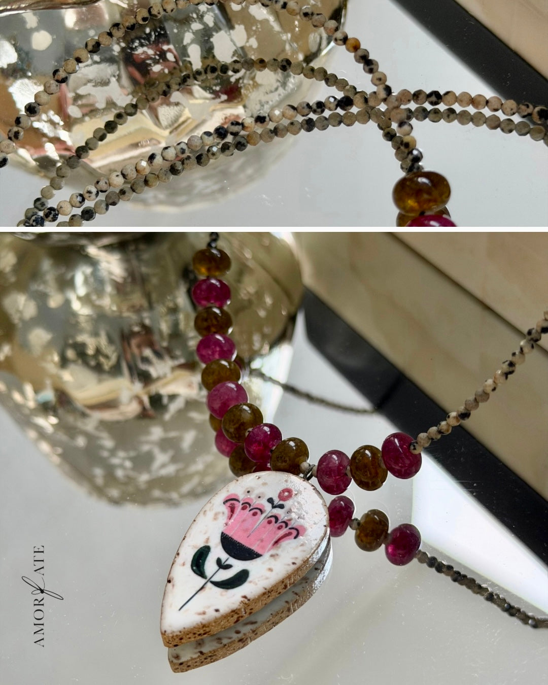- Materials: agate, dalmatian jasper, ceramic handpainted charm