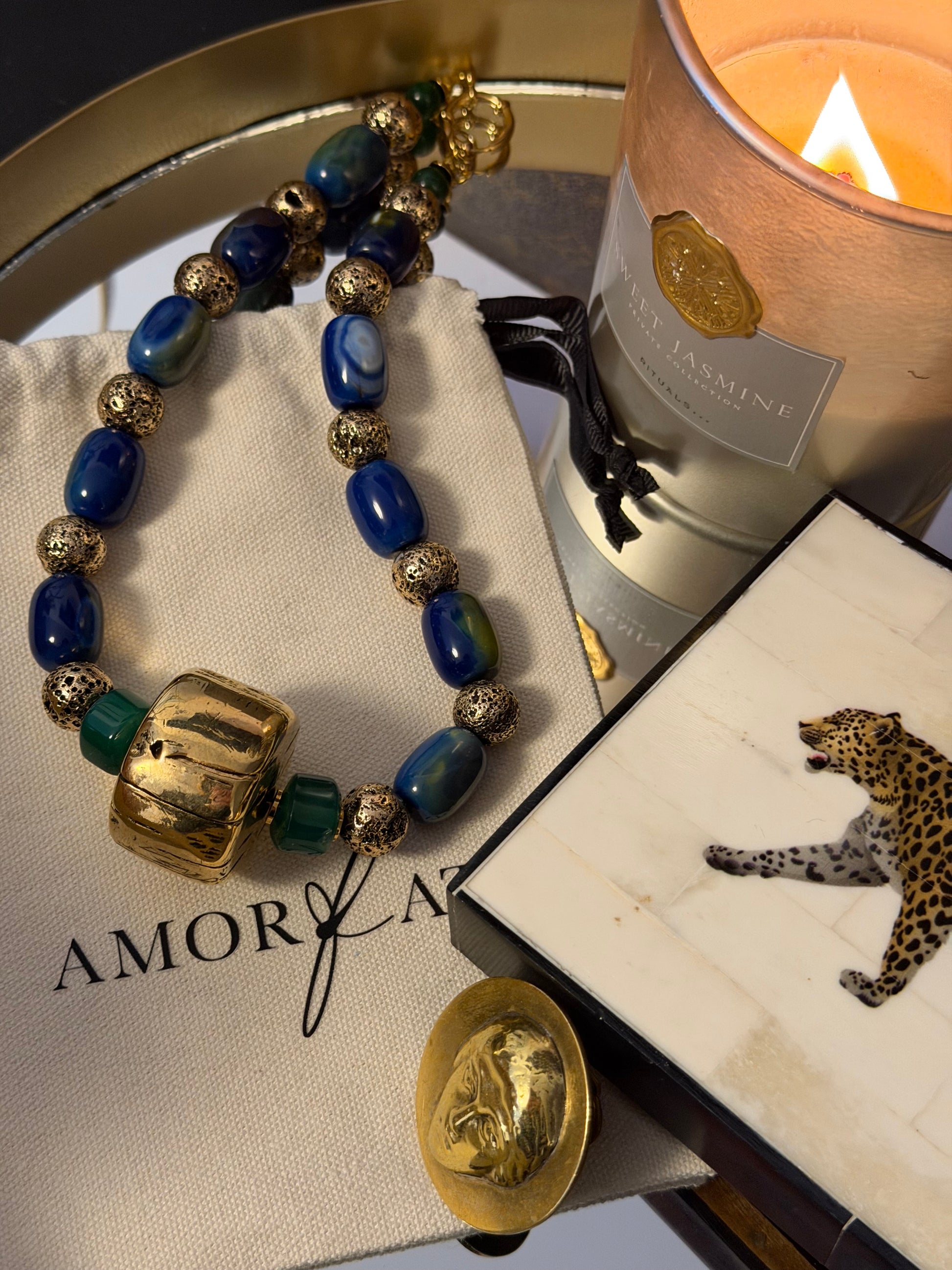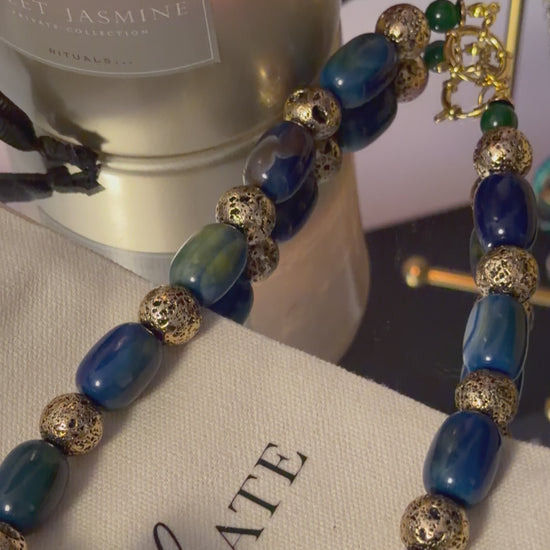 - Materials: lightly gold-plated metal charm, agate, hematite